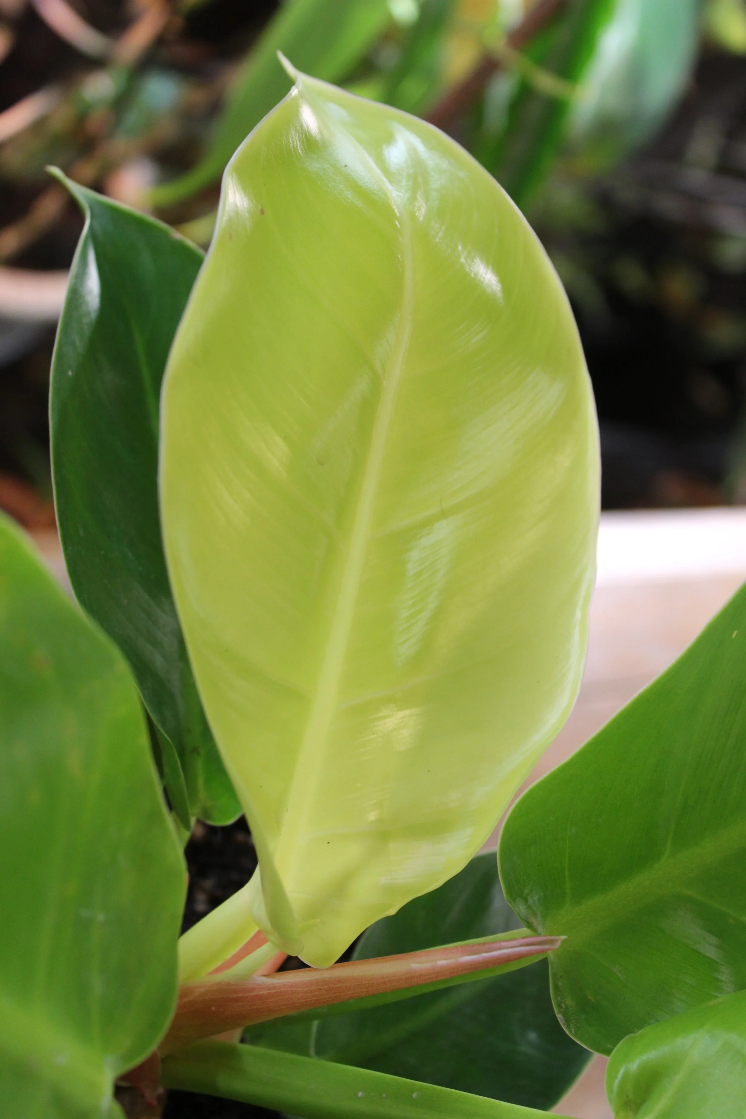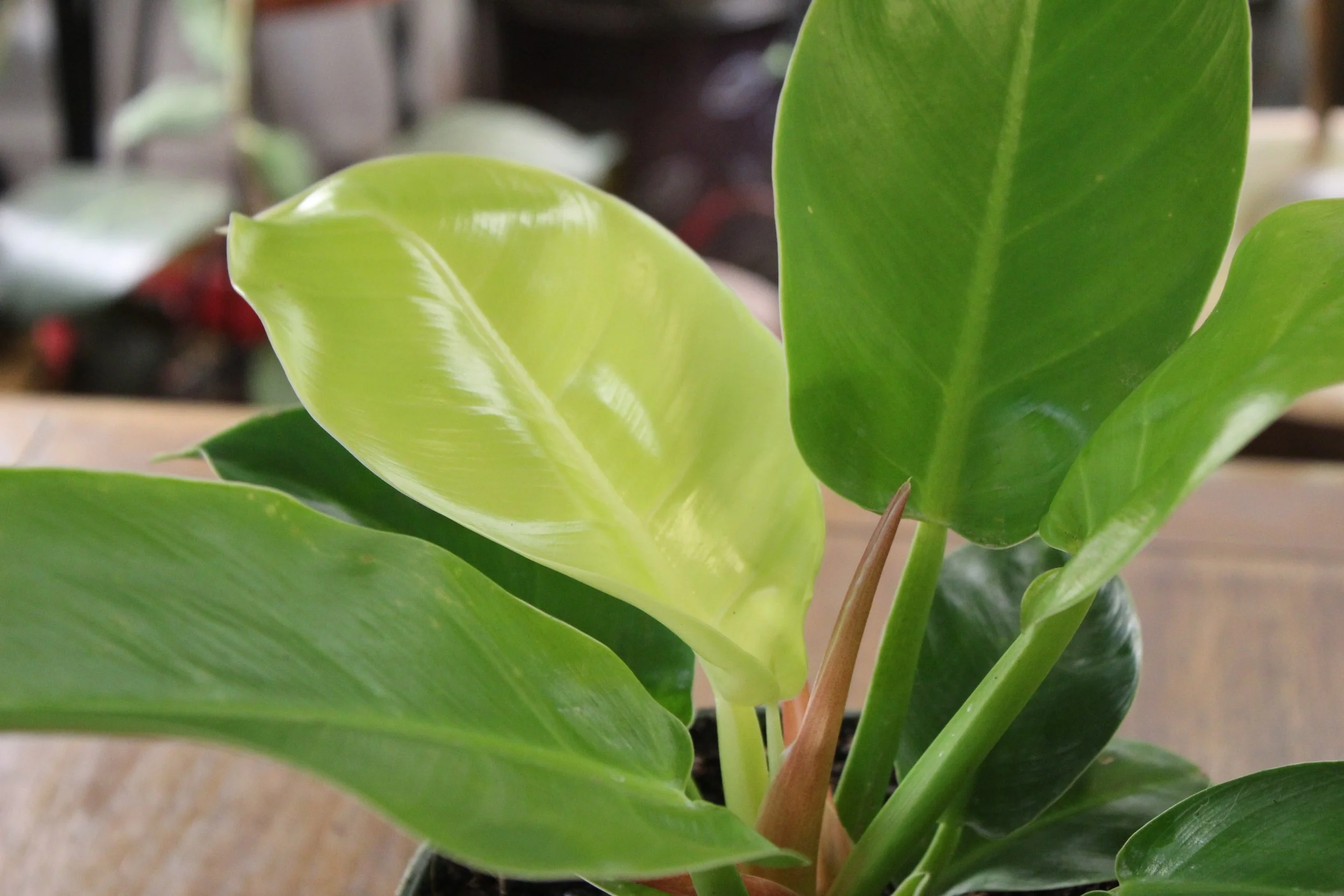 The new growth points on this philodendron are hot pink, which is very striking against the lime.